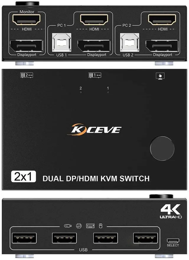 ^^ Ultra HD 4k Visual EnjoymentSupport high resolution of 4K@60Hz, please use HDMI 2.0 cable and DP 1.2 cable to achive 4k@60Hz resolution. 2 USB cables, 1 HDMI 2.0 cable, and 1 DP 1.4 cable provided, please prepare the rest cable yourself. No external power adapter required, but please plug USB cables to give enough power. ^^ With 4 USB 2.0 USB PortsThis a 2 in 2 out DP HDMI KVM switch with extra USB 2.0 port for sharing mouse, keyboard, USB printers, scanners, etc,. Compatible with a variety of computer systems, such as Windows 10/7/2000 / XP / Vista, Linux, Unix, Ubuntu, Fedora, etc.