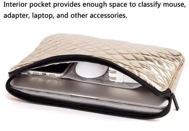 ^^ Laptop Fits Well - There is little space around the interior sides and top, so that your laptop doesnt bounce around too much inside the sleeve when carrying. And the space isn't tight, it is easy to insert and remove the laptop. ^^ Personalized and Refined Look - Gold and silver PU leather are with diamond pattern quilted, appears shiny bling and fashionable look. Cowhide textures faux leather are luxurious, refined, and quality, appears business formal look. ^^ Tips - To ensure the sleeve will fit your laptop, youd better measure your laptop and compare it with the product interior dimension before purchasing.