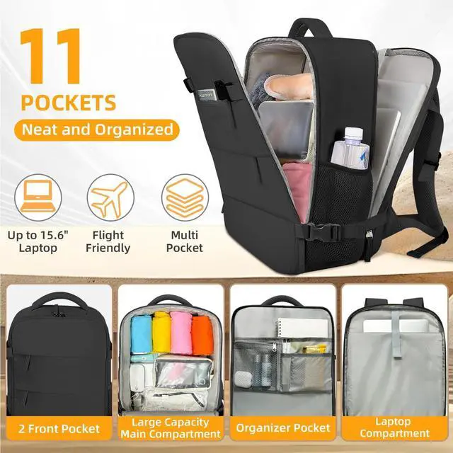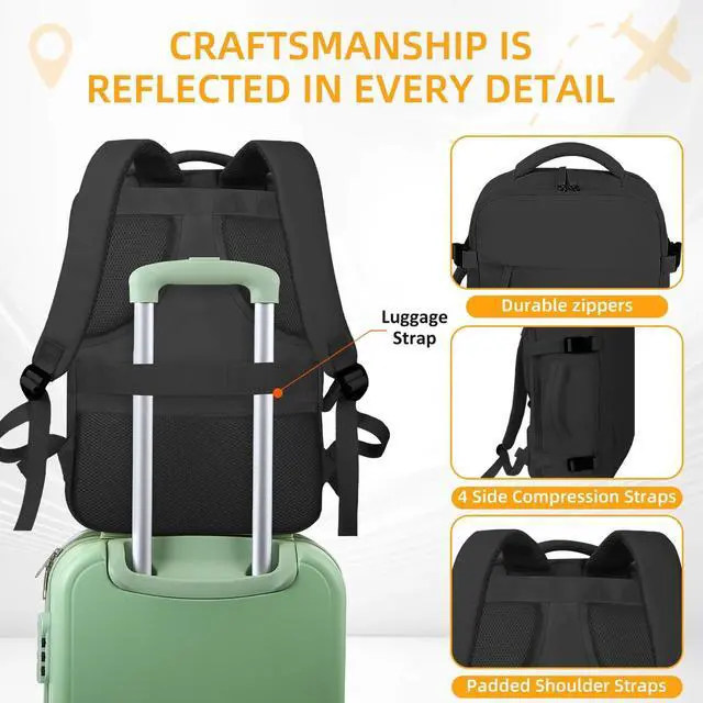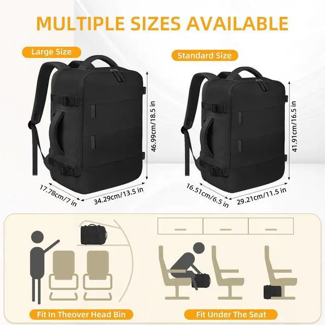 There are two sizes available: 16.5 x 11.5 x 6.5 inch and 18.5 x 13.5 x7 inch, comply with the majority of airline regulations for personal item bags, ensuring hassle-free travel. ^^ LARGE CAPACITY & MULTI-POCKETThis suitcase backpack has many pockets to keep items tidy and orderly, helping you find what you want faster. The spacious main compartment with a 180 zipper closure can accommodate many items, including 1 mesh pocket and 1 wet bag, 2 zippered front pockets, and 1 laptop compartment with a storage bag for storing other small items such as laptops, pens, headphones, etc. The elastic mesh pocket on the side can be used to hold umbrellas or water bottles. ^^ 3 IN 1 BACKPACKSide handle helps you seamlessly transition from a backpack to a carry on bag, providing flexibility for any travel scenario. The backpack mode ensures comfort and frees your hands during the journey, while the luggage strap allows you to effortlessly secure it to your suitcase, adding an extra layer of convenience. Choosing this carry on backpack can effectively enhance your travel experience. ^^ 4 ADJUSTABLE SIDE COMPRESSION BUCKLE & DOUBLE ZIPPERThis carry on backpack for airplanes use 4 adjustable side buckles to firmly secure your items, reduce item displacement, and maintain stability.