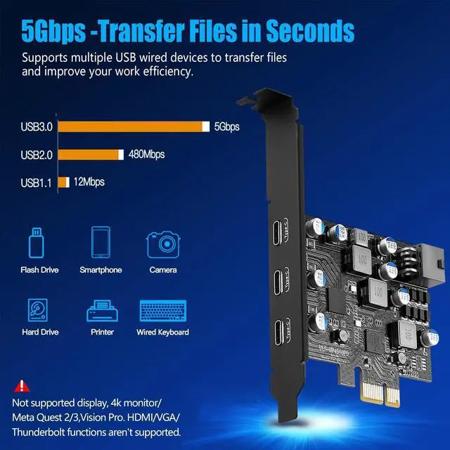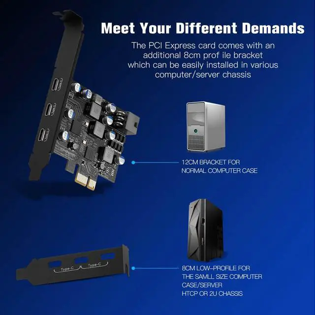 Product advantages: 1. Add 3 USB C ports on the desktop through the PCI Express slot, -each port has a maximum data transmission speed of 5Gbps to achieve a fast connection. 2. USB PCIe card has built-in YEELIYA power supply control technology with up to 20W charging power, fast charging for devices that support PD 2.0 / 3.0, BC 1.2 and AFC charging protocols. (For optimal PD performance, connect an external 6-pin power outlet, which requires a separate power supply. 3. To meet your varying needs, we also offer standard (installed) and low-profile brackets for easy installation in standard PC/mini-computer cases. 4. The internal USB card provided from the motherboard through the PCI Express slot ensures a stable connection and improves data transmission speed. Will not lose the connection problem like an external USB Hub.