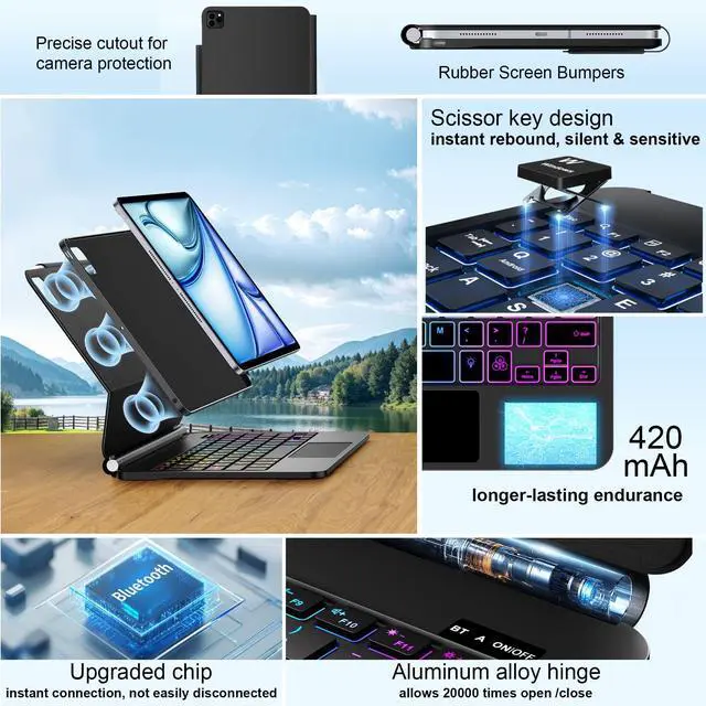 Ultra-Strong Magnets: Experience a seamless laptop setup. Powerful N54H magnets allow the keyboard for iPad Air 13 inch to attach instantly and securely, rivaling the magic keyboard iPad air 13 inch experience. The magnetic floating stand adjusts up to 135 for the perfect viewing angle. ^^ Larger Touchpad for