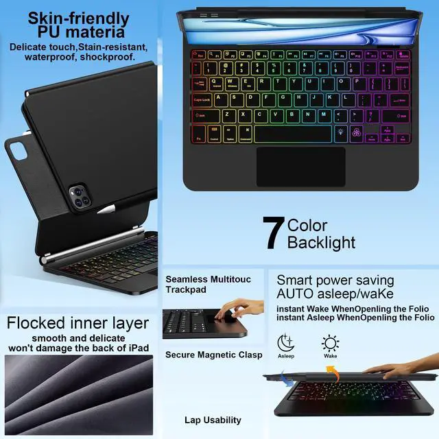 Back Case: The ultra-light, detachable back case provides full-body protection without bulk, making it the ideal iPad air 13 inch case with keyboard and iPad Pro 12.9 Case with Keyboard for work and travel. ^^ 7-Color Backlit Keyboard with