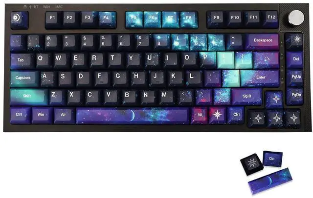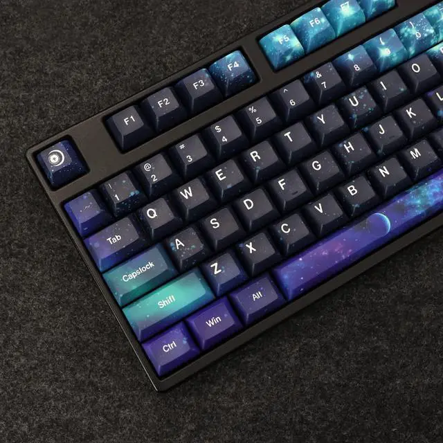 PBT dye sublimation keycapsPBT keycaps have a stable molecular structure, corrosion resistance and high heat resistance. It makes the characters and patterns of keycaps brightly colored, not easy to wear, clear and non-fading ^^ KCA Profile KeycapsThis keycap has a high and low profile layout, adapting to the arc of movement of manual striking for a comfortable feel. Ergonomic design ^^ Custom keycapsKeycap set full 139 keys, including 104 standard keys and 35 modifier keys, suitable for most ANSI/ISO layout cherry mx switch 61/68/84/98/104/108 mechanical keyboard. Keycap spacebar is 2u/ 2.25 u/ 2.75 u/3u/ 6.25 u/7u ^^ Starry sky or Star wars theme keycapsThe keyboard keycaps are minimalist style, we call it "Starry Sky or Star wars"theme, novelty color matching, very unique and beautiful, will be a powerful addition to your keyboard personalization ^^ Note139 keycaps and a keycap puller are included, keycaps only, keyboard not included.