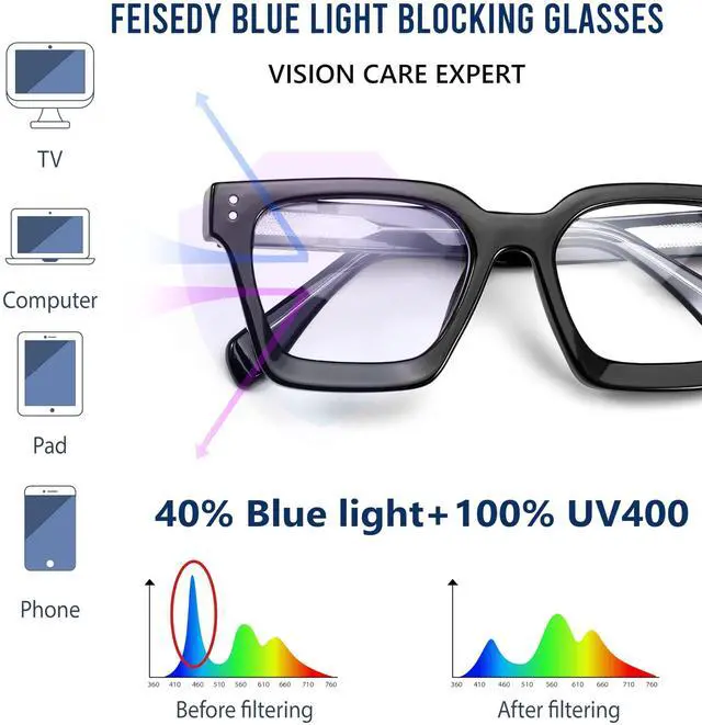 Bridge: 0.78 inches (20mm). ^^ Healthy and Comfortable WearingThis fashion thing is not only healthy for wearers, but also very comfortable, because it is so light weight that can be wore with no pain sense for several hours. This also suitable for outside activities, but put it off before you go to bed. ^^ FEISEDY anti-blue light glasses can effectively resist harmful blue light from digital screens, and can significantly reduce eye fatigue, glare, headaches, migraines caused by games or reading mobile TV digital displays, and protect your glasses.
