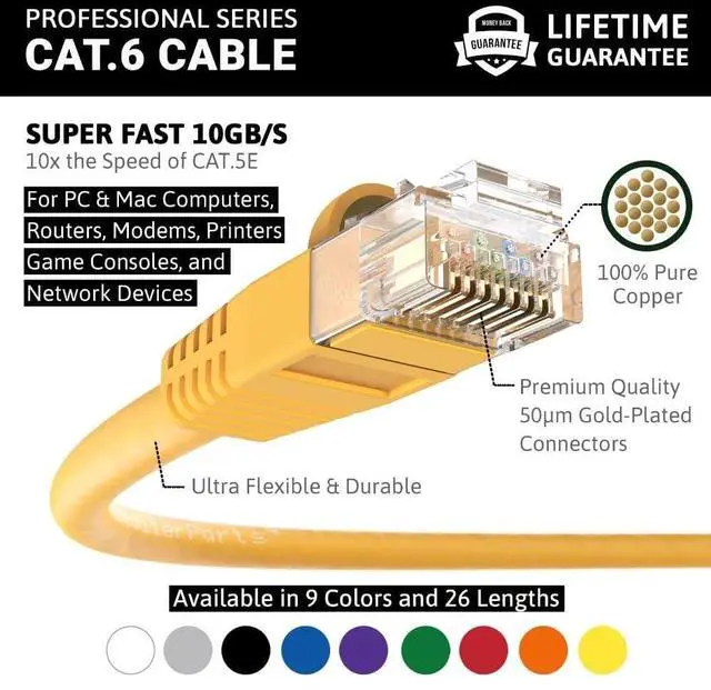 Our cables use high quality, long-lasting materials and feature A highly durable design at an affordable price. ^^ 50 Micron Gold Plated Contacts RJ45 plugs with 50 Micron gold plated contacts and molded strain relief boots provide secure network connection and durability. ^^ Maximum Compatibility Use the Cat6 patch cable to connect devices on a Local Area Network (LAN), such as laptops, PCs and Mac, network servers, printers, routers, switches, game consoles and more. TIA/EIA T-568B standard wiring. UL/CULl listed. RoHS comliant.