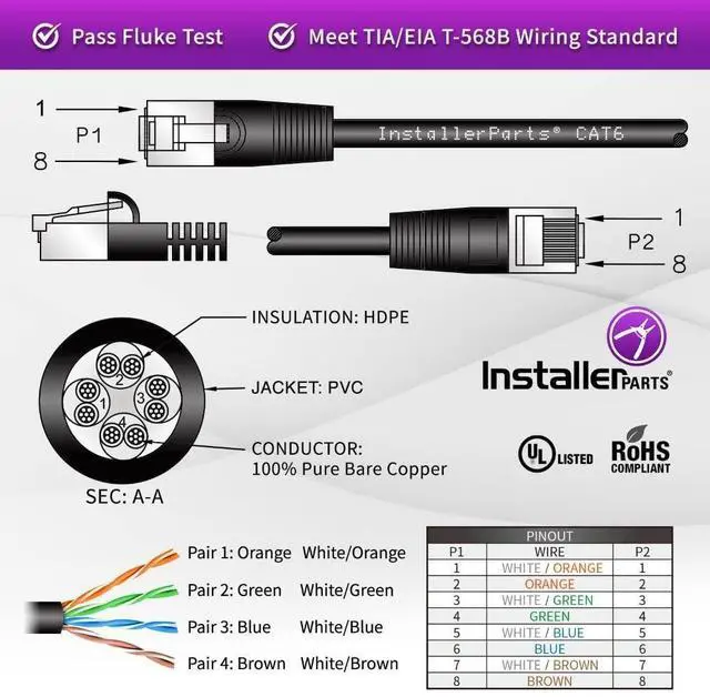 • High quality 100% copper Installerparts patch cables are made f 100% bare copper wire with 50 micron gold plated RJ45 plugs. Our cables use high quality, long-lasting materials and feature A highly durable design at an affordable price.