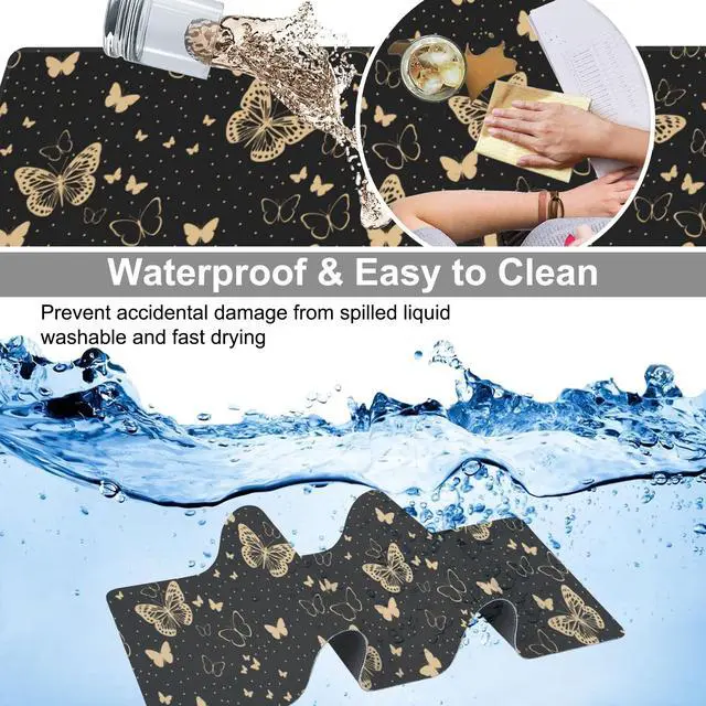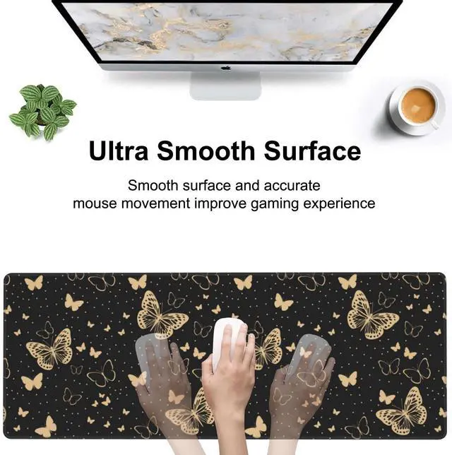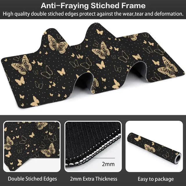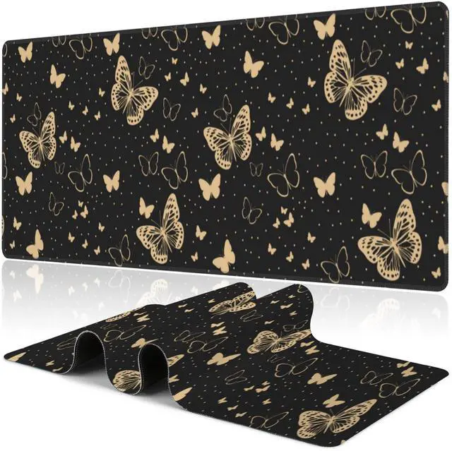Golden Butterflies Desk Mat,Large Butterfly and Round Spots Gaming Keyboard Mouse Pad,Non-Slip Rubber Base Desk Pad Thick Stitched Edges Waterproof Mousepad Mouse Mat 31.5"x11.8"
