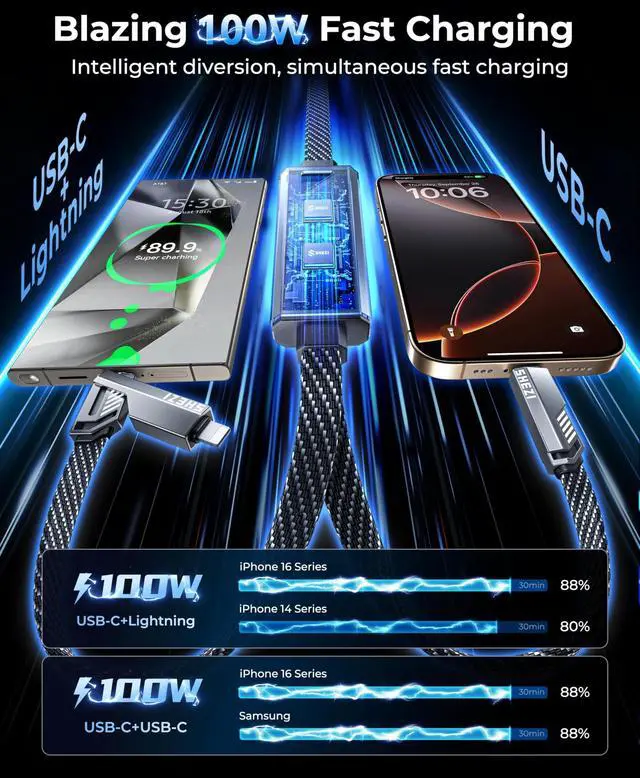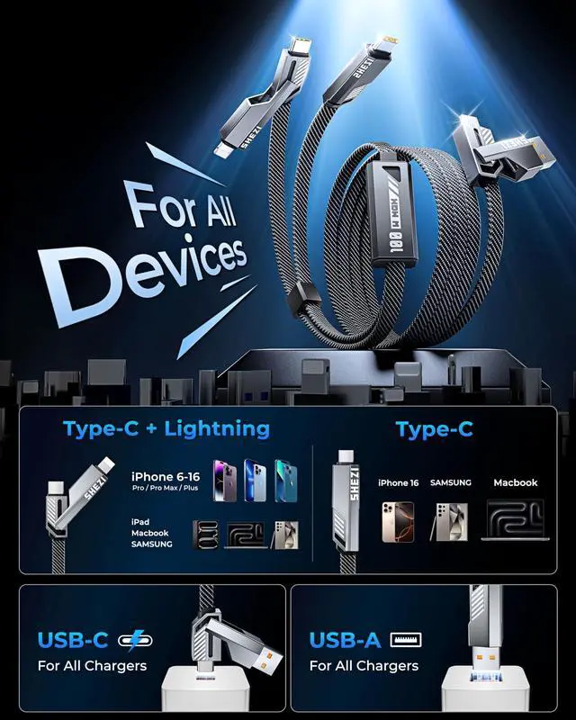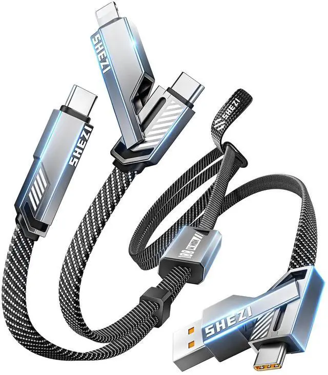 has two output cables: one with a USB-C connector and the other supporting a switch between USB-C and L tips. This charging cord is suitable for office, home, and travel, and can be used by multiple people ^^ [100W 5X Fast Charging] The SHEZI usb c cable is capable of being compatible with all iPhone series and can simultaneously charge the iPhone 16/15 up to 80% and the Samsung S24 up to 88% in just 35 minutes. (The 100W usb to usb-c cable is also compatible with100W, 65W, and 18W; just make sure the adapter used is appropriate) ^^ [CarPlay & Android Auto Support] The SHEZI usb c cable support carplay and android auto for a seamless smart drive. Get directions, make calls, and play music easily with voice control or touch. Intelligent car connectivity for a safer, more convenient drive without cords ^^ [480Mbps Data Transfer] The multi charging cable supports data transmission at usb 2.0 speeds, up to 480Mbps, enabling 1GB file transfers in just 20 seconds ^^ [Durability and Unbreakable] The new upgrade features a zinc alloy process that reinforces the connector and port, making them sturdy.