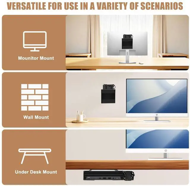 A solid, reliable, neat and efficient installation solution for your HP Mini PC! Designed specifically for the HP EliteDesk, ProDesk, and Pro Mini series, this mount is designed to help you maximize the use of space and enhance the quality of your work environment with more solid workmanship, thoughtful details, and more effective cooling assistance. Why is this stand more worth choosing? Sturdy and Durable, Worry-free