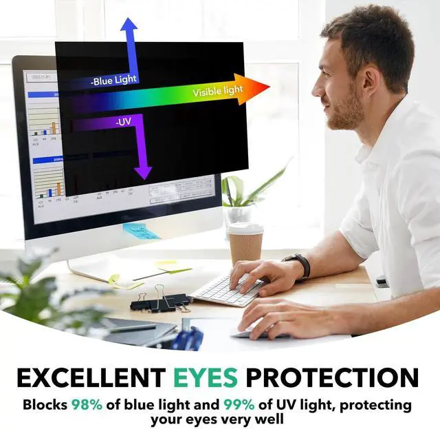 ^^ Protect Your Eyes: NAQIDY 32 inch curved privacy screen for computer monitor prevents glare and softens harsh light, by blocking 98% of blue light and 99% of UV rays, further protecting your eyes from harm. Both two sides can be used: The glossy side of the protector provides extra clarity and greater privacy, and the matte side minimizes glare and distracting reflections, you can choose different sides as needed. And our privacy screens are reusable and removable.