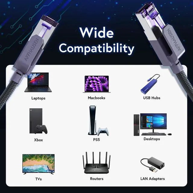 ^^ Universal RJ45 Compatibility: Features shielded plated RJ45 connectors on both ends; backward compatible with Cat5/Cat5e/Cat6/Cat6a/Cat7 devices including routers, modems, PS5/PS4, Xbox, switches, PCs, smart TVs, and more.