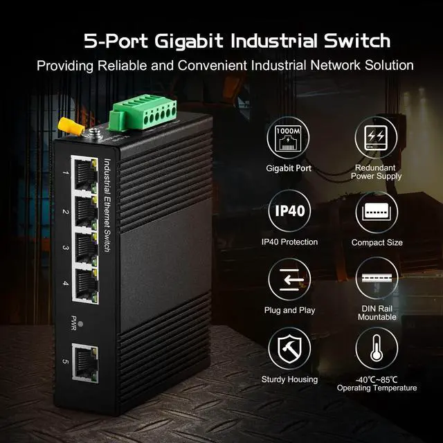 5 GE PortsThis din rail switch include 4 gigabit ethernet ports and 1 gigabit uplink port, all support 10/100/1000Mbps adaptive. 14Gbps switching capacity with better performance. Plug and play, directly connected to the peer device, no need to configure the port ^^ Industrial IP40This is a industrial grade switch, using sturdy aluminum alloy casing and industrial grade electronic components, working temperature -40~75C(-40~185F), anti-lightning, anti-static and anti-overload protection ^^ Redundant PowerSupport 2-way industrial grade power interface input, automatically switchover when 1-way fails without any downtime, high reliability ensures continuous business operation.