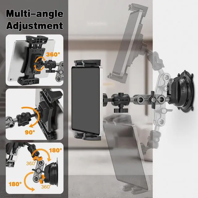 Heavy-Duty Tablet Car Mount - This tablet truck mount with a strong suction cup and a metal base, can easily attach the mount to windshields, dashboards, consoles, desktops, walls, tables, glass, etc, and suitable for cars, trucks, semi-trailers, RVs. The suction cup is very strong, which ensures that you can keep your tablet/phone stable and never slide or fall when facing bumpy road conditions. ^^ 360-degree 2 Long ArmsThe tablet stand has 2 metal arms + 360 swivel ball joint. The flexible arms support a 180-degree swivel adjustment.