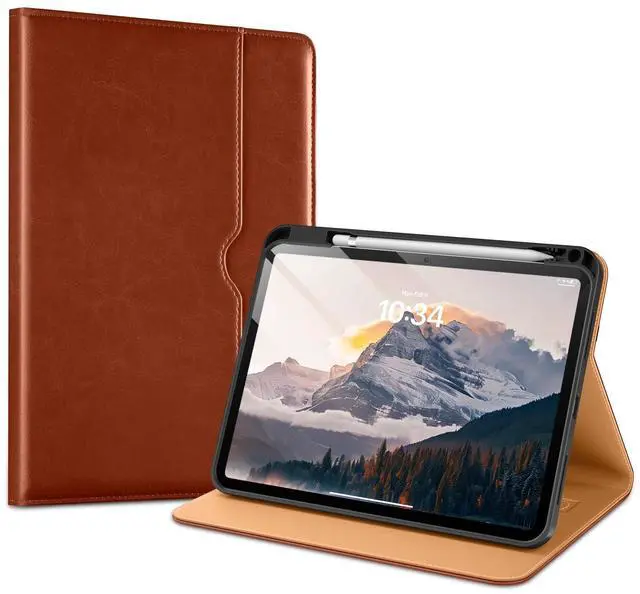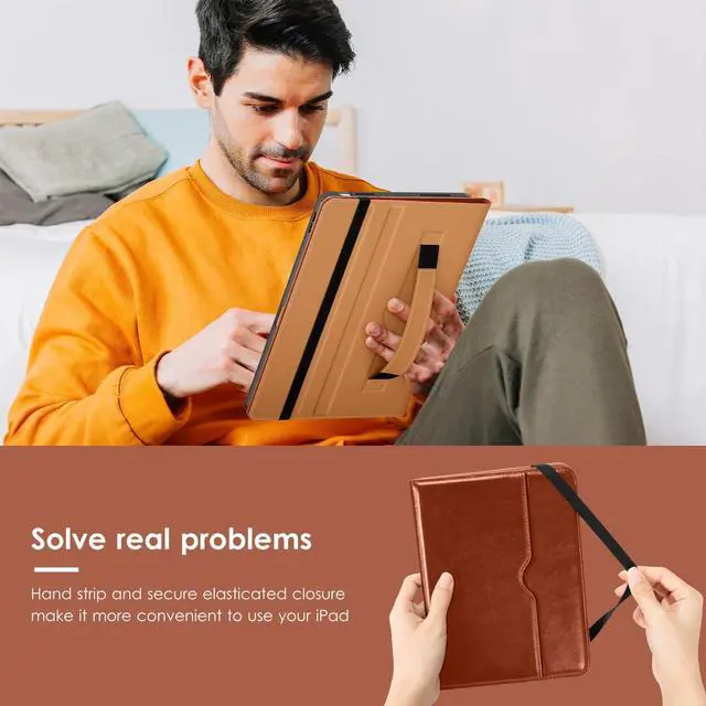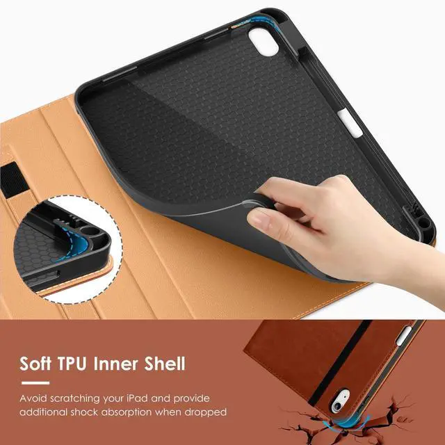 ^^ [Fashion And Protection]: Offers the difference by full protection Design, leather back provides strong support, anti-fingerprint and anti-scratch. Soft TPU frame protects your iPad from shocks, drops and shocks. Hand strap helps you secure the front cover.
