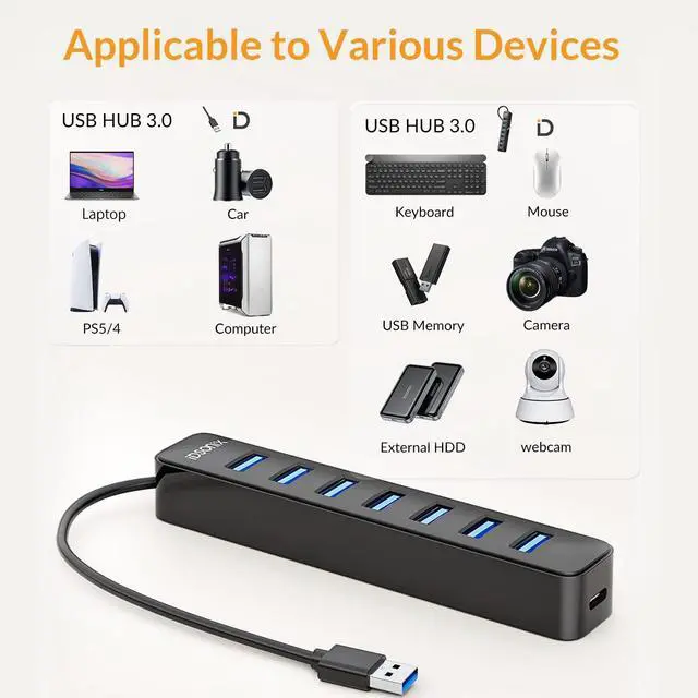 7 Port USB Hub 3.0 This usb expansion hub turn one USB port into seven, including support for USB Flash drive, Mouse, Keyboard, Printer or any other USB Peripherals.