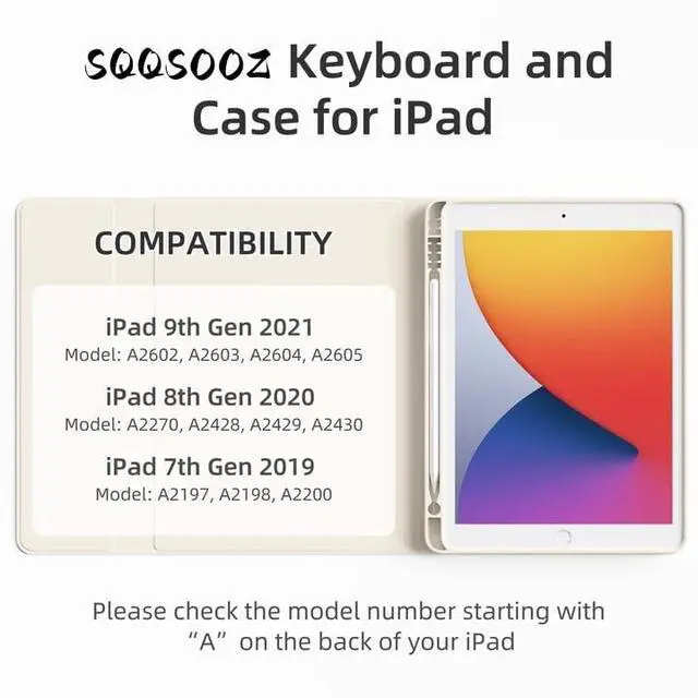 Case Only for iPad 10.2 inchSQQSOOZ keyboard case specifically designed for iPad 9th Generation 2021 (Model number: A2602, A2603, A2604, A2605); for iPad 8th Generation 2020 (Model number: A2270, A2428, A2429, A2430); for iPad 7th Generation 2019 (Model number: A2197, A2198, A2200). (Note: Please check your the "AXXX" model number printed on the back bottom of your devices before purchasing.)