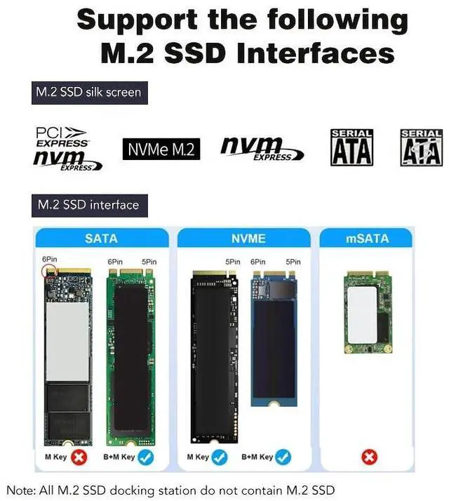Please Note: 1>. M. 2 reader temperature of the entire operating SSD may exceed 60 C. please do not touch the SSD. 2>. NVMe dock Do NOT compatible with M. 2 SATA AHCI B Key SSDs, please check with the picture details 3>. and does not support M. 2 SSD with heat sink