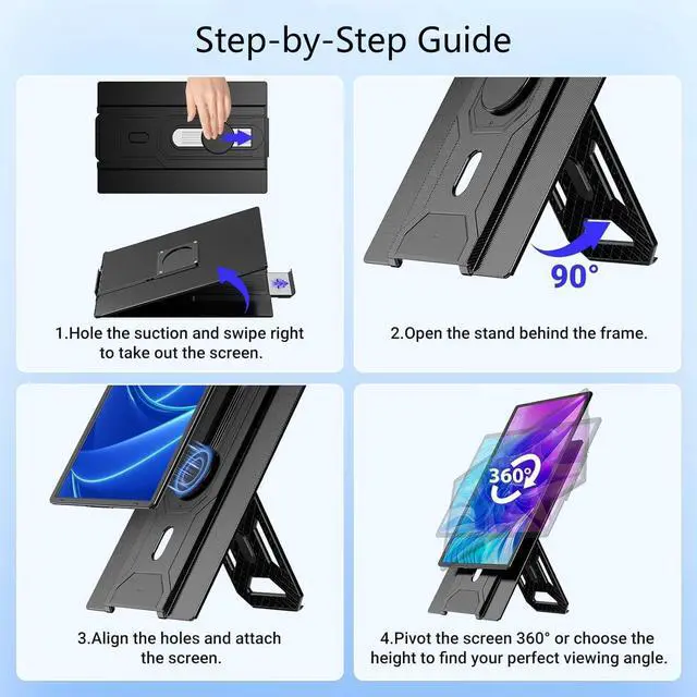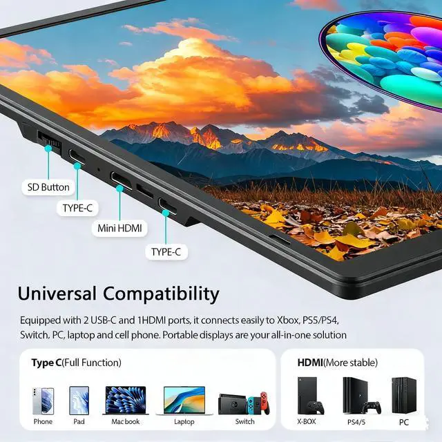 360 Rotatable Stand This portable second monitor for laptop features a 360 rotatable stand, allowing you to adjust the screen to any anglelandscape, portrait, or anything in between. Its a perfect laptop dual monitor attachment for those who need a vertical screen for coding or a horizontal display for movies. ^^ Wide Compatibility Equipped with MINIHDMI and TYPE-C ports, this laptop monitor extender is truly plug and playno drivers needed. It works seamlessly as a portable second monitor for laptop with Windows, macOS, ChromeOS, and gaming consoles like PS4.
