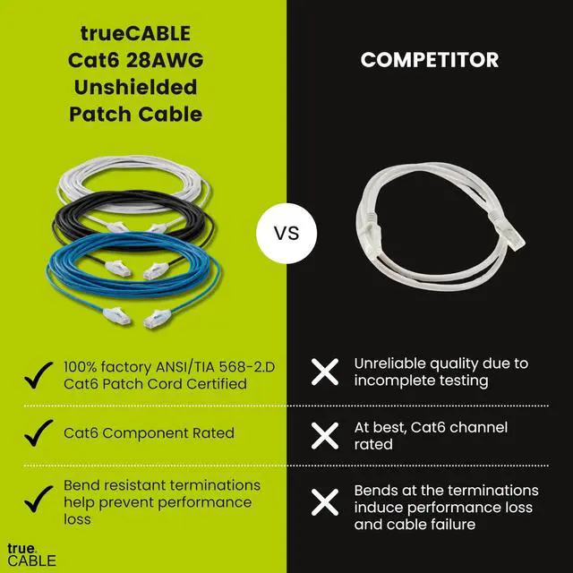 [Extreme Performance] Our Cat6 patch cord supports lightning-fast data transfer rates up to 10Gbps, great for demanding applications like streaming 4K video, console & pc gaming. Component rated and PoE++ ( 802.3 bt) 4PPoE up to 100W. ^^ [Quality Guaranteed] Constructed with 28AWG stranded pure copper conductors and 50m 24kt hard gold-plated contacts for long-term reliability and signal integrity, helping maintain clear and consistent network connections. ^^ [Versatile] Thin-diameter construction makes these cables perfect for wiring patch panels, racks, equipment enclosures, and routing through modular furniture.