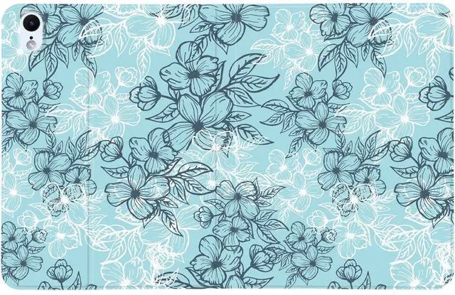 • - This MAYCARI tablet case features a classic floral theme, showcasing black and white line art of flowers against a lake blue background. This elegant design effortlessly combines style and functionality.