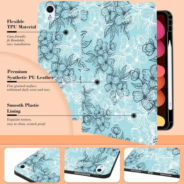 MAYCARI White Lake Blue Flowers iPad Case for iPad mini 6 2021 8.3 Inch with Pencil Holder Handmade iPad mini 6th Generation Case Floral Fine Grained iPad Protecitve Hard Case with Auto Wake/Sleep
