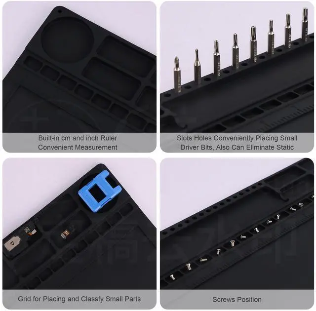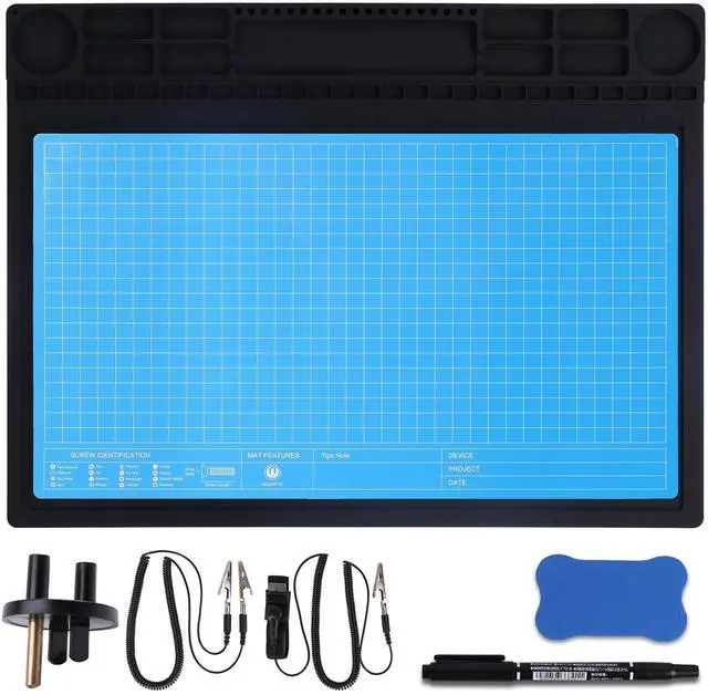 This product uniquely combines the anti-static mat with the powerful magnetic project mat. the anti-staitc mat with ESD groudning accessories offers complete ESD protection for sensitive electronics such as circuit boards and chips, magnetic project mat help you organize small parts, screws, tools, components and sort into provided areas and by writing down the location and model number of screws or parts, to avoid mistakes during the repair process. ^^ ESD Safe For Electronics - The Anti Static Mat is a high quality ESD soldering mat designed for a safer and better work surface to sensitive electronics assemble and repair or soldering.