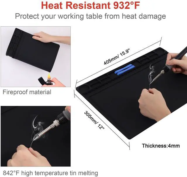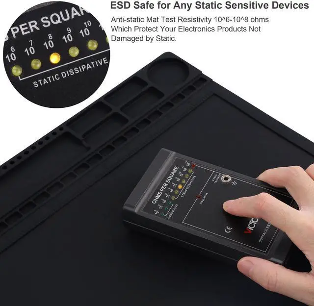 The resistivity value of the mat is 10^6 - 10^9 ohms which is best protecting sensitive electronic. ^^ Heat Resistant 932F -The anti static mat is resistance to high temperature of 932F protect your desk from burning and ruining. Compared with rubber materials mat, it has better heat resistance at high temperature. Meanwhile, the Mat has big size 15.9 x 12provide bigger space to satisfy many projects like for repairing mobile phone, computer circuit board, iPad, camera so on electronics. Its great for professional repair store, DIY handyman and electronics workshop.