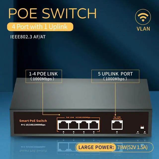 4 Ports PoE Switch Upgrade your network with our 4-port PoE switch. With 4 PoE/PoE+ ports and 1 Uplink port, all operating at up to 1000Mbps speed, you can expect excellent network performance. ^^ 78 W High Power Our switch supports the IEEE 802.3 af/at PoE standard protocol, delivering a total power of 78W and up to 30W per port. This ensures sufficient and stable power supply, perfect for connecting multiple devices. ^^ Plug and Play Say goodbye to complex configurations. Our PoE ports support automatic detection, allowing you to seamlessly connect both PoE and non-PoE devices such as PoE cameras, APs, computers, NVRs, routers, and more.