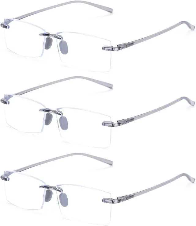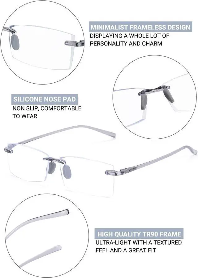 Reading glasses designed for comfort, Zero pressure even after long hours - comfort is the most important thing. ^^ Designed for comfort - With a weight of only 18g, they fit well and can be worn comfortably all day long. ^^ Added comfort - High quality TR90 frame is ultra-light with a textured feel and a great fit, while the one-piece silicone nose pad does a super job at improving comfort and preventing sliding. ^^ Fashion Rimless Reading Glasses - This pair redefines what reading glasses should look like with its minimalist frameless, displaying a whole lot of personality and charm.