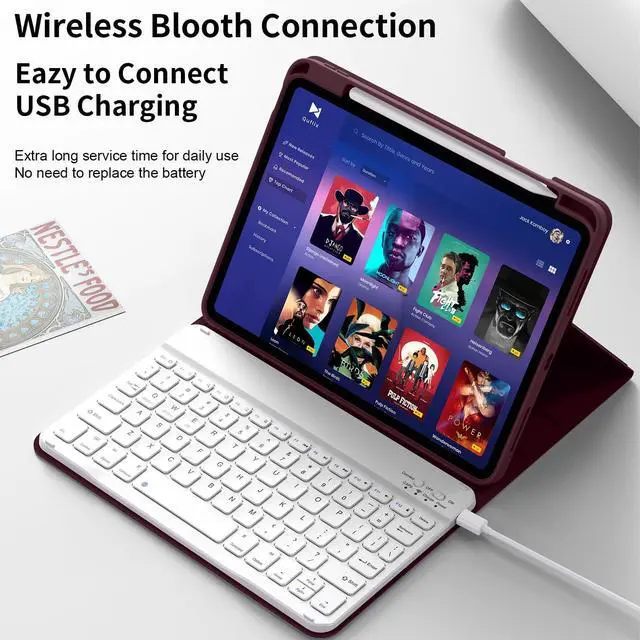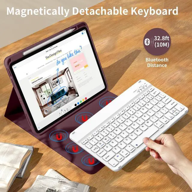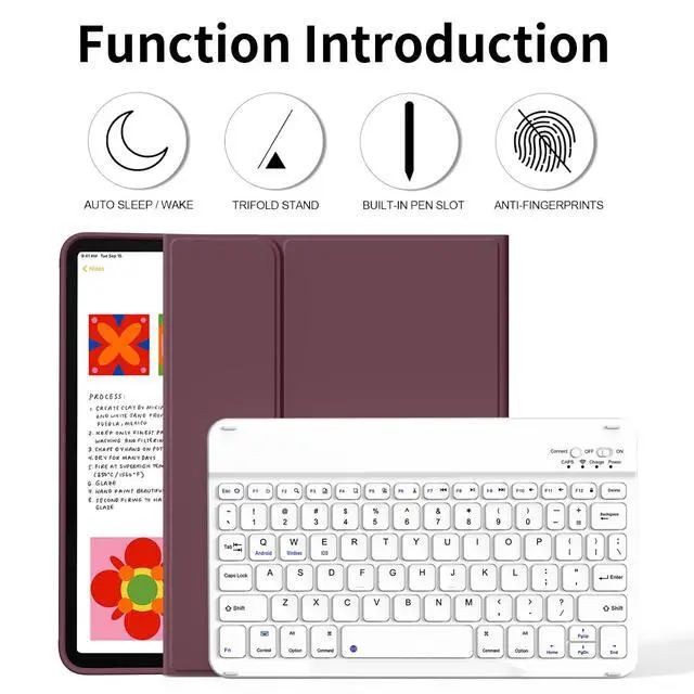 Slim Wireless Bluetooth KeyboardThe slim (6.2mm) removable keyboard is attached to this iPad cover with keyboard magnetically (supporting Windows, IOS & Android System), let your ipad instantly become a portable laptop, perfect for working, typing, editing or watching videos, greatly improved your iPad productivity.