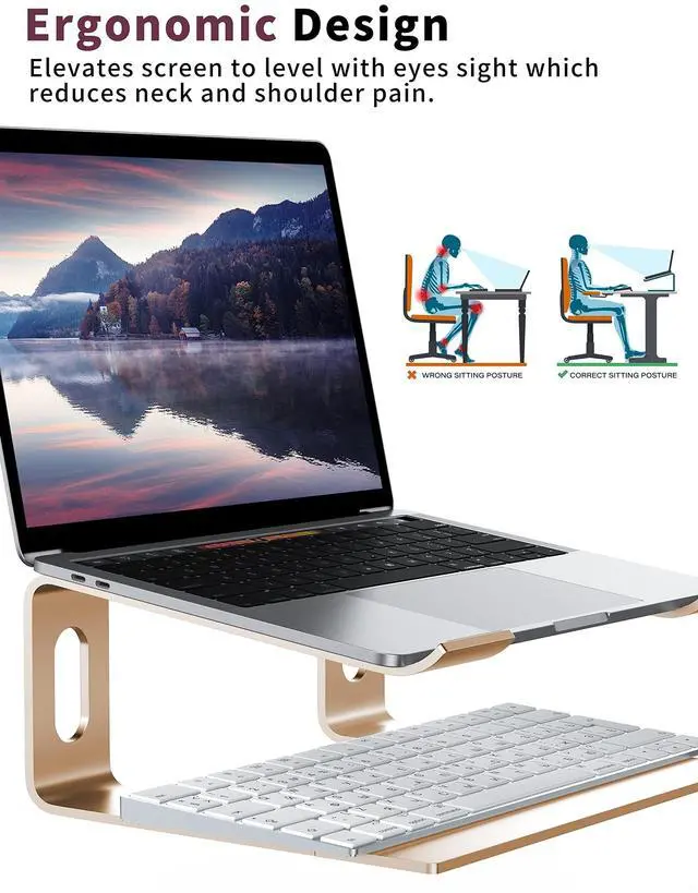 Broad Compatibility - Suitable with laptops of 10 to 15.6 inches, such as MacBook Pro 13/15, MacBook Air 13.3, Dell, XPS, Lenovo, HP, ASUS, Google Pixelbook, Samsung and other notebook computers of 10, 11, 12, 14, 15.4, 15.6 inches, etc. ^^ Ergonomic Design - Elevates your laptop height by 6 inches, a perfect height for your eye, neck and shoulder. ^^ Durable & Protective - Metal appearance made of thickened aluminum alloy, strongly durable. The rubbers on the top and bottom of holder ensure it sticks tightly to your laptop and desk, and protect your computer and desktop from scratches.