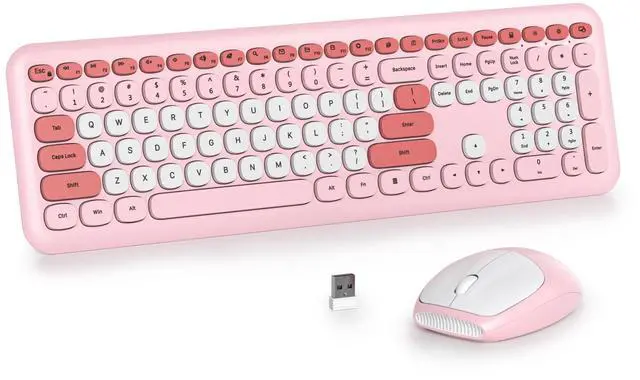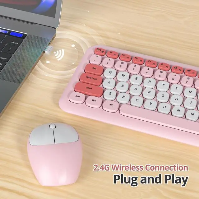 • 2.4GHz Wireless Connection - No more tangled wires or limited mobility. Our cute keyboard and mouse wireless utilizes 2.4GHz wireless technology, allowing you to connect seamlessly to your devices without any lag or interference. The plug-and-play functionality requires no additional software or driver installation, guaranteeing hassle-free setup and compatibility with v