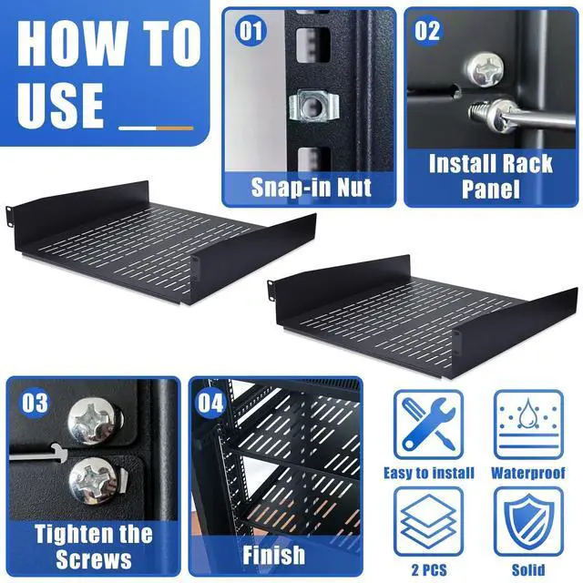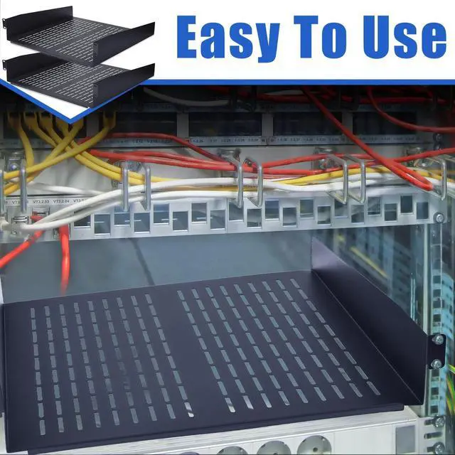 2 Pack rack shelf vented rack mount shelf universal heavy duty server rack shelf for 19 inch network equipment rack and cabinet 16 inch deepConstructed using spcc commercial grade cold rolled steel, this fixed rack shelfThe universal fixed server rack cabinet shelf lets you add a compact fixed storage shelf to any standard 19 inch server rack or cabinet with front mount options. The shelf has no rough edges and is powder coated black, which matches the cabinets.