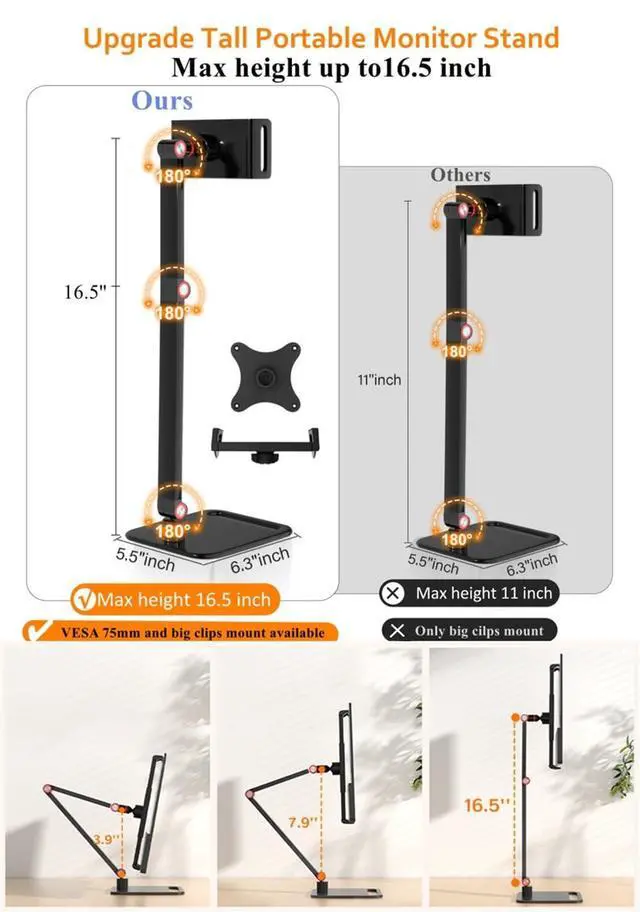 Inch: Lengthen Long Arm height adjustable from 3.9 inch to 16.5 inch, It is a good helper for you to mount the extra monitor above the laptop, and very well for use your monitor/tablet in various scenarios - watching movies, playing games, reading, viewing recipes, etc.