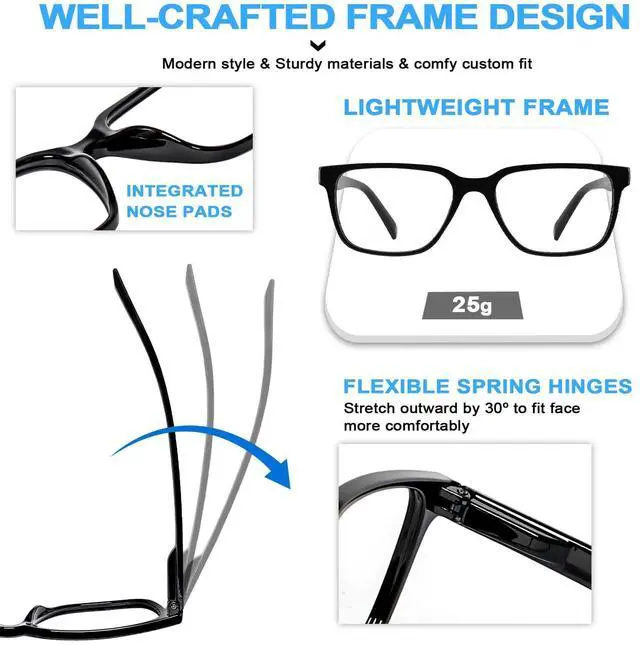 • SOLID, NICE LOOKING, COMFORTABLE - Modern design reader glasses are crafted by sturdy and skin-friendly frame materials. Well polished arms equipped with spring hinge make a comfy custom fit to your face. Integrated nose pads let the specs sit nicely on nose, no slip, no red marks.