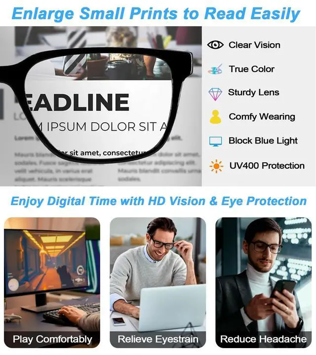 • SUPER CLEAR CLOSE-UP VISION - These blue light blocker readers 2.75 for men have high definition magnifying lens to enlarge small prints on books, paper, phone, menu or details on nearby abject. Clear and comfortable visual experience, high light transmittance, accurate color, no worry blurry vision. Such a functional and convenient tool for your daily life.