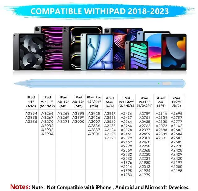 Higher: This pencil compatible with iPad a16/10th Generation 9th/8th/7th/6th/Pro 13 inch M4/Air 13 inch M3/M2/Air 11 inch M3/M2/Air 3rd/Air 4th/Air 5th Gen/Pro 11 inch M4/Pro 11inch 1st/2nd/3rd Gen/Pro 12.9 inch 3rd/4th/5th/6th Gen/Mini 5th/6th Gen; Stylus Pen for iPad is not compatible with models before 2018; Not applicable for iPhone, Android, and Microsoft devices ^^ 10Mins