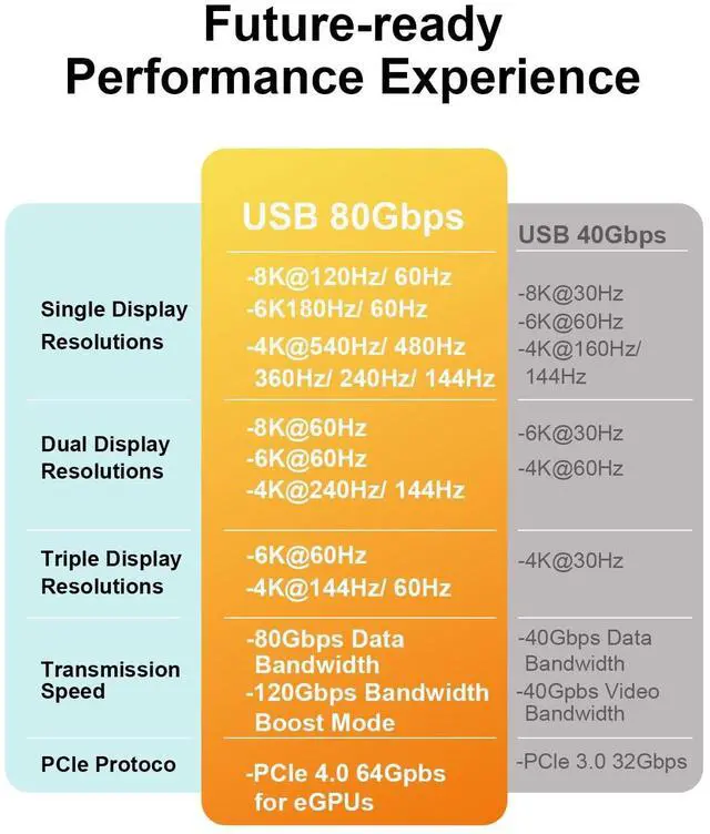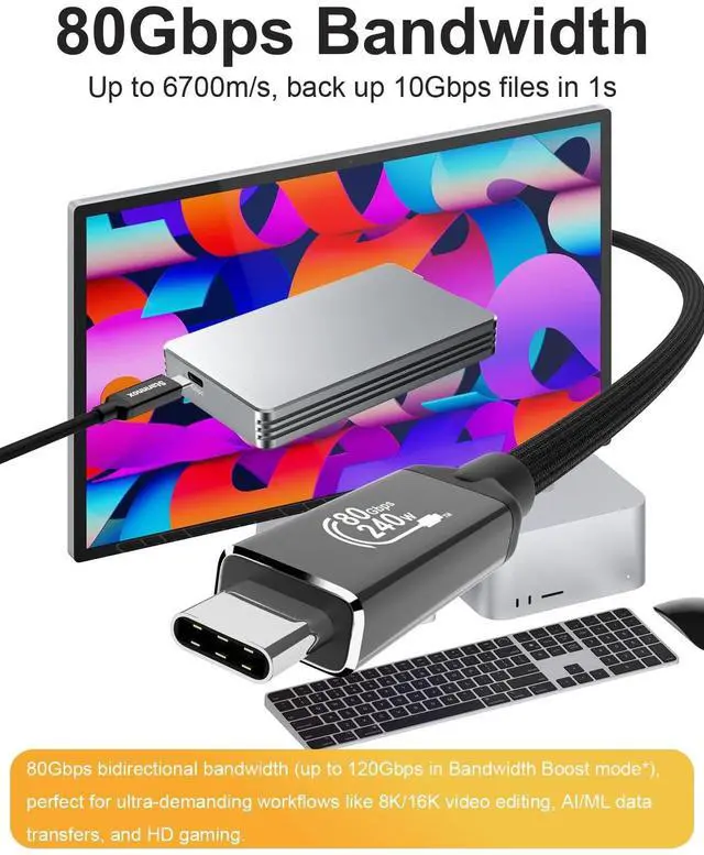 [80Gbps Data Transfer] Experience lightning-fast bidirectional data transfer speeds of up to 80Gbps with the Starinnox USB 4 Version 2.0 cable, allowing you to back up 6GB of files in just one second. Say goodbye to long wait times and boost your efficiency. This USB-C cable is fully compatible with Thunderbolt 5, ensuring premier connectivity. Achieve ultra-fast data transfers at 120Gbps (asymmetric mode) or stable 80Gbps (symmetric), perfect for 8K video editing, gaming, or massive file backups. ^^ [Multiple Screen Setups] Immerse yourself in an extraordinary visual realm with a stunning maximum resolution of 16K.