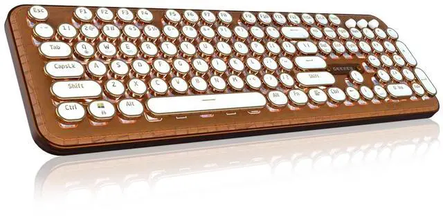 Equipped with a 1450mAh rechargeable lithium battery, it offers around 15 days of battery life after 2 hours of charging. A USB A-C charging data cable is included, measuring 1.6 meters / 5.2 feet in length. ^^ [Typewriter Keyboard with Mechanical Switches] - This retro punk keyboard features mechanical blue switches and round keycaps with golden rings, combining vintage style and modern technology. The blue switches have a lifespan of 60 million keystrokes, offering fast response, distinct tactile feedback, and a typewriter-like sound. The keycaps adopt double-shot injection molding technology, ensuring uniform light transmission for characters, which can be clearly displayed in dark environments.