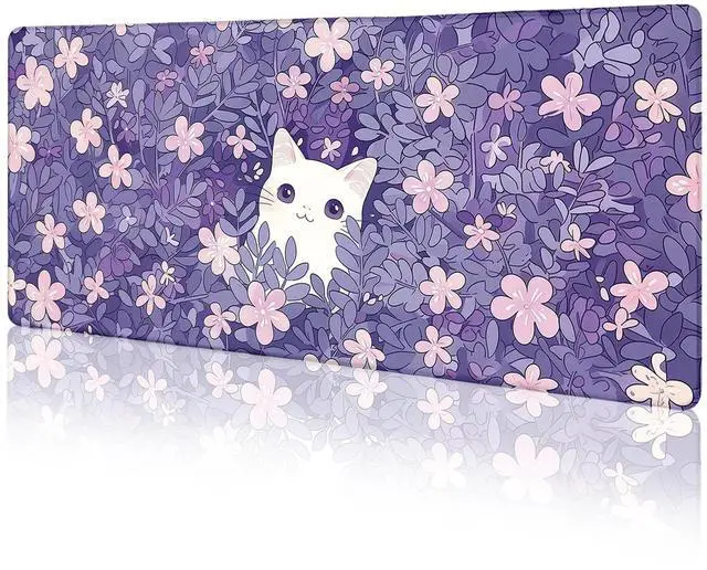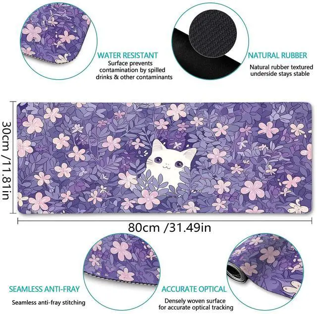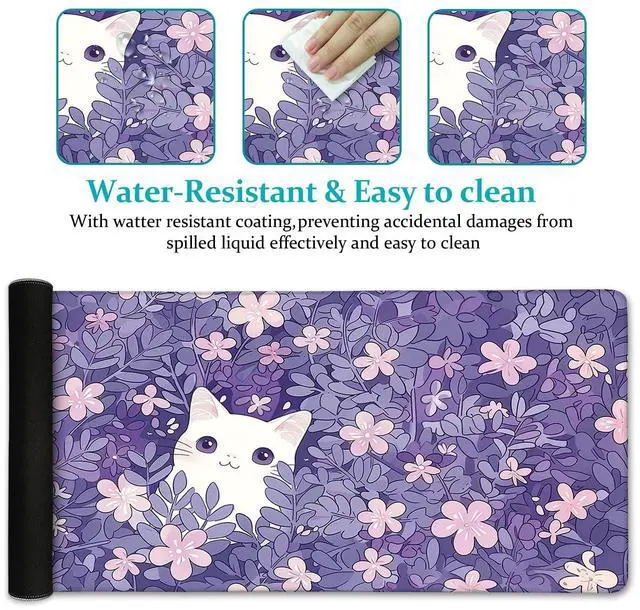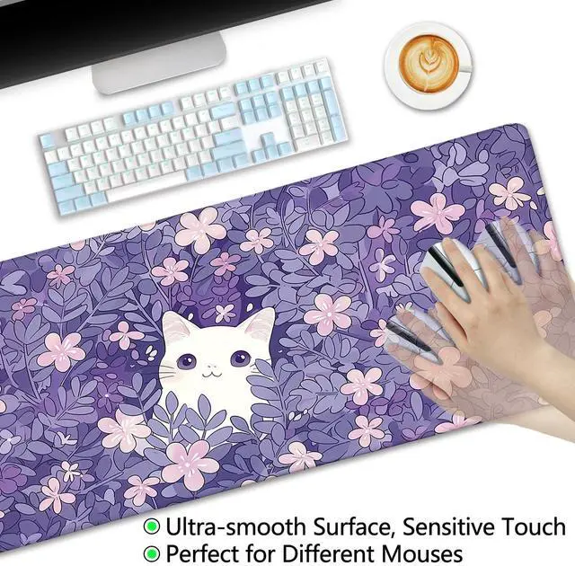 Playful Design: This kawaii big extended keyboard mat features a vibrant dreamy purple design with a cute white cat hidden in the flowers, keeping you in a cheerful and joyful mood. our mouse pad adds a touch of cuteness and playfulness to your workspace. It makes a perfect gift for cat lovers and brings a smile to your face every time you use it ^^ Extra Large