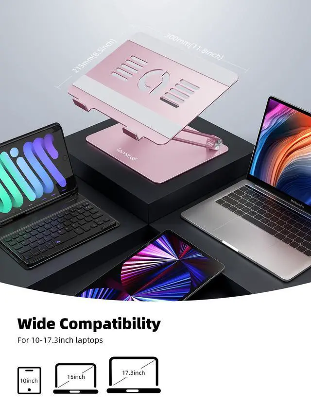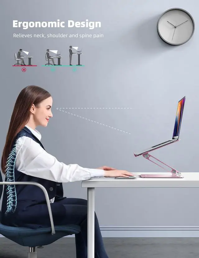 Wide Compatibility: The laptop stand for desk is compatible with all laptops from 10" up to 17.3", including popular models like MacBook, MacBook Air, MacBook Pro, Surface Laptop, Dell XPS, Google Pixelbook, HP, ASUS, Acer, Chromebook, Alienware, etc. ^^ Adjustable &
