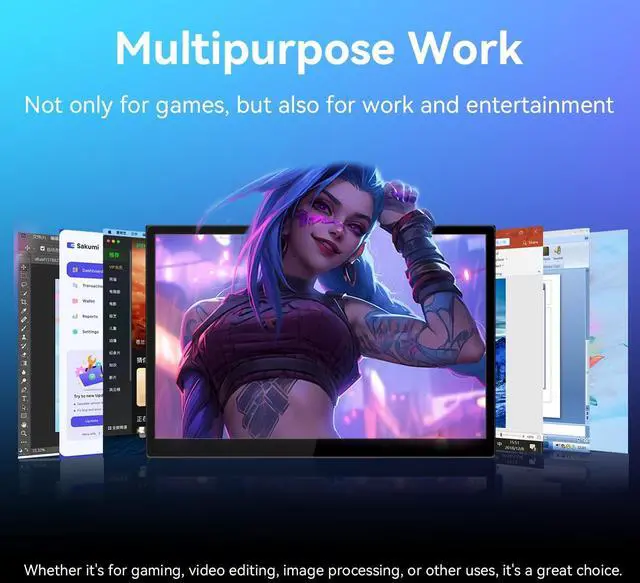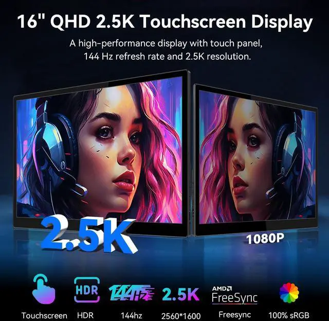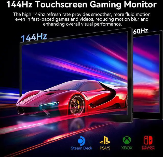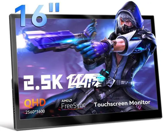 2.5K 144Hz Portable Monitor16 inch portable touch screen monitor with QHD 2.5K (2560x1600) resolution, IPS screen, 100% sRGB, 400cd/ brightness 178 full viewing angles and HDR technology to provide clearer, smoother, superior gaming/multimedia performance. The 144hz high refresh rate eliminates screen smear and avoids motion blur in gaming. ^^ 10-Point Touchscreen MonitorThis laptop monitor touchscreen boasts a 10-point capacitive touch feature, providing a highly accurate, responsive, and seamless touch experience regardless of switching, swiping or zooming, boost your work efficiency through intuitive touch. ^^ Wide CompatibilityTouch screen monitor equipped with 2 full-featured USB Type-C ports(support USB 3.1 interface), 1 standard HDMI port and OTG port (connect mouse or keyboard), effortlessly connected to a variety of devices such as laptop, PC, Xbox, PS3/PS4/PS5, smartphones(USB Type-C 3.1 version)or Switch etc with just one USB Type-C cable.