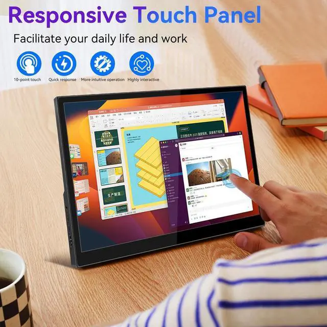 ^^ Optional Display ModesUSBC touchscreen monitor has multiple display modes to choose from: duplicate mode/extension mode/second screen mode. It can copy your laptop's content as second screen to share with others during meetings, and can be used as a second extended screen to enhance productivity at work as well. ^^ Built-in Speakers& KickstandNo additional driver is needed, just plug and play. The VESA and adjustable kickstand integrated design makes the touchscreen usbc monitor an ideal travel partner for laptops and phones as second screen to boost work productivity. Two built-in speakers provide an amazing viewing and gaming experience.