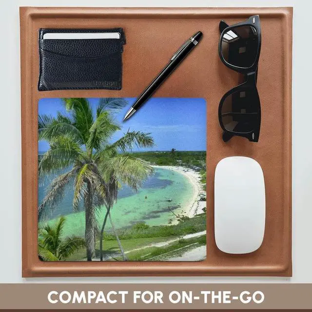 Tropic Beach Mouse Pad is 8" x 8" x. 25" and is made of heavy-duty recycled rubber. Matte finish image will not fade or peel. Machine washable using a mild detergent and air dry.