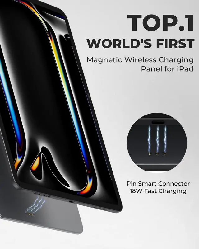 Wireless Charging Panle: Simply attach your tablet to the magnetic panle and connect the charger, it will start charging automatically, super convenient! The world's first magnetic wireless charging for iPad via the PIN smart connector with up to 18W of power. The original Type-C port remains open and usable for connecting other devices while the tablet charges wirelessly ^^ Upgrade from