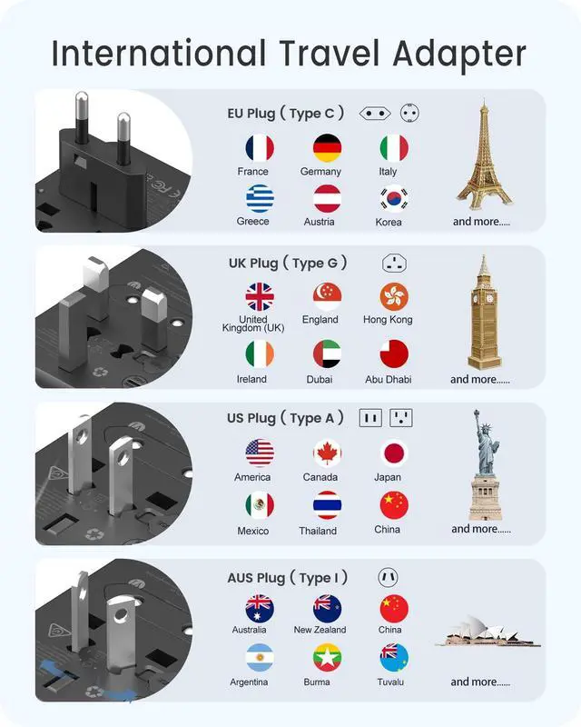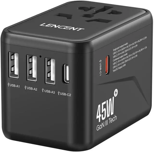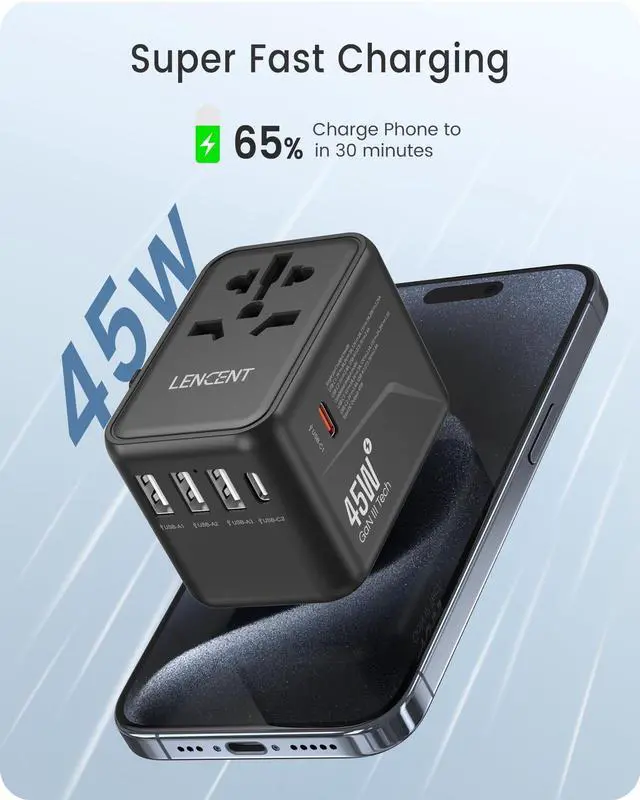 Wide world TravelPortable( 7.7 * 5.4 * 5.3 cm) and lightweight (160g) USB adapter with interchangeable UK / US / EU / AUS plugs and international voltage compatibility, easy to carry, allows you to charge multiple devices simultaneously anywhere when you want. Works in over 200 countries and is compatible with almost USB devices. ^^ 45W PD USB C Charging With smart charging technology, it delivers an optimized charge to USB devices according to your device's needs. The single USB-C1 port (45W Max) can fully charge your laptop in 2 hours, or an iPhone 14 from 040% in 30 minutes.