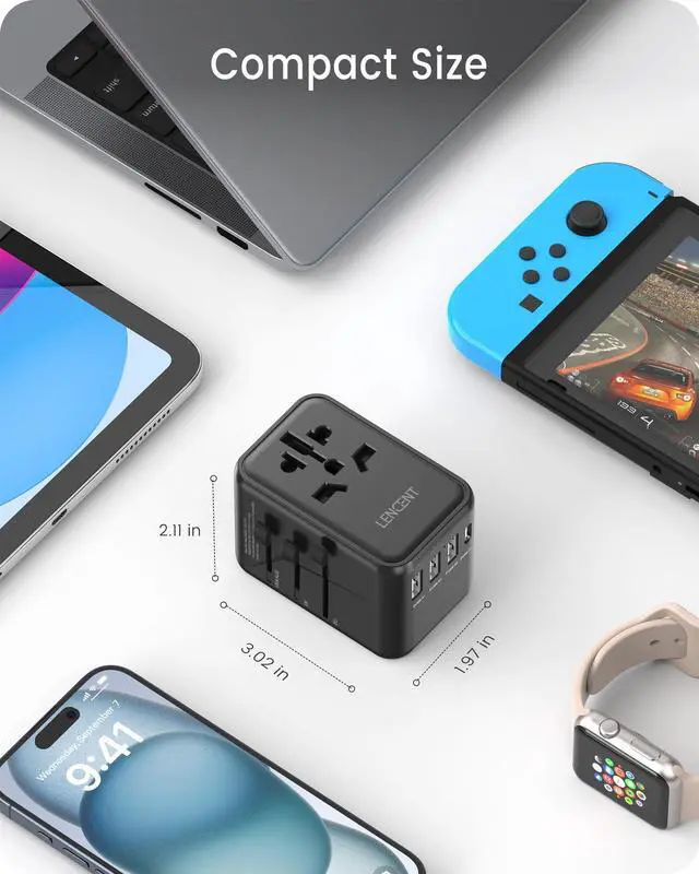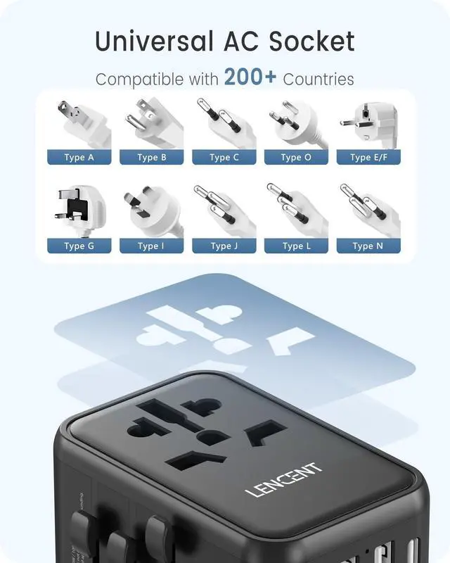 Equipped with integrated double 10A fuse for overload protection and safety valve, it will protect people from injury if they directly touch live parts on the socket. ^^ AUTO-ID Technology for Intelligent Charging The LENCENT travel adapter with 2 USB ports&3 Type C ports is capable of intelligently identifying connected devices and detecting and delivering optimum charging current, ensuring fast and safe charging.