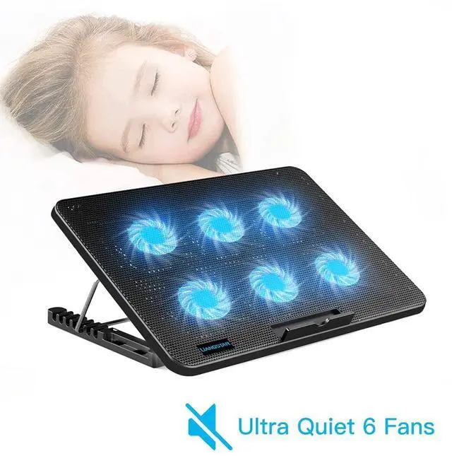 6 Ultra Quiet Fan & Adjust Fan Wind SpeedThis special laptop cooler with 6 ultra quiet fans. Our laptop cooling pad 6 fans can work together, or 3 fans run separately, two separate switch control fan speed from 0 to max freely ^^ Unique 7 Height Adjustable & Phone Holder Design The cooling pad have 7 height for you select, free adjust suit different laptop. Unique phone holder stored on the left side of the laptop cooler base, can conveniently put your phone or tablet in cooling pad left or right to view information easily ^^ 2 USB Port & Large Metal Mesh Our laptop cooling pad is quipped with 2 USB ports, one port to continuously power the cooling pad while using the other port to connect your mouse, keyboard or other device.