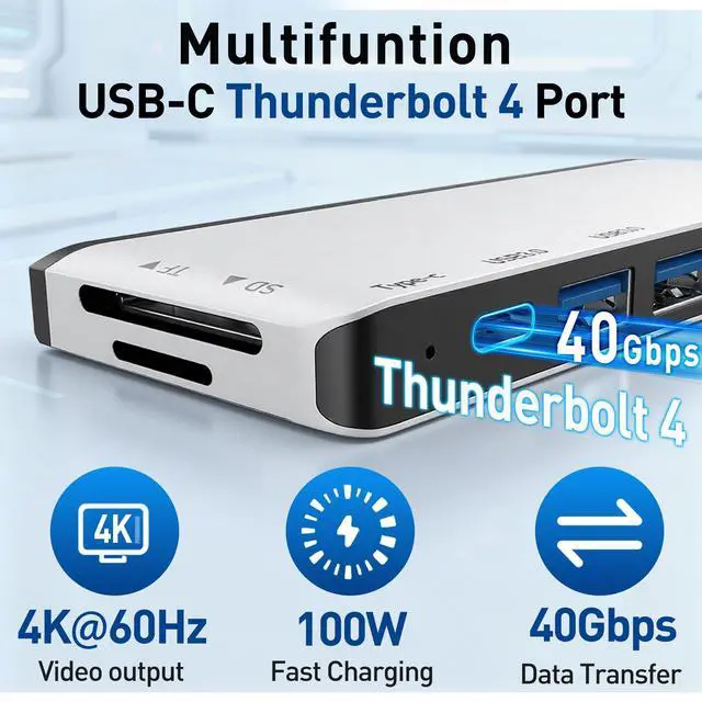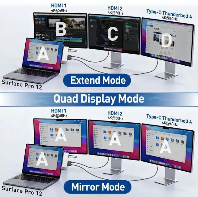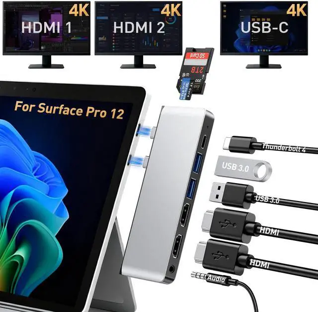 Please note: For a perfect fit, remove any protective case from your Surface Pro 12 before use. ^^ Quad Display Surface Pro 12 docking station - This Surface Pro 12 USB Hub enables you to extend your desktop across three external monitors (via dual 4K HDMI ports and one Thunderbolt 4 USB-C port). Quad display (4K@60Hz HDMI + 4K@60Hz HDMI + 4K@60Hz USB-C Thunderbolt 4 ) + Surface Pro 12 modes Boost your efficiency 4 times. Supports connection to TVs, projectors, etc. to meet a variety of demand scenarios. Support Extend Or Mirror Mode, Resolution up to 4K@60Hz; An ideal Gadget for Video Editor, Photography, Programmer. ^^ Surface Pro 12 Adapter with High-Speed Data Transfer - Experience unparalleled data transfer speeds with this advanced adapter. The Thunderbolt 4 USB-C port delivers blazing-fast 40Gbps connectivity, while the two USB 3.0 ports offer up to 5Gbps transfer rates. The built-in SD/TF card slot supports super-speed reading at up to 480Mbps and is compatible with a wide range of cards (including SDHC, SDXC, TF, and UHS-I) with support for capacities up to 2TB. This allows you to quickly import photos, videos, and other large files.