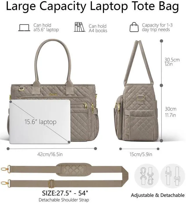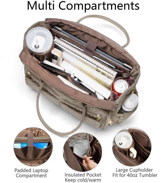 Teacher Tote Bags for Women, 15.6 inch Laptop Work Tote Nurse Bible Bag With Large Cup Holder & Insulated Pocket Quilted Shoulder Handbag Laptop Briefcase for Work, Daily, School, Travel, Gifts